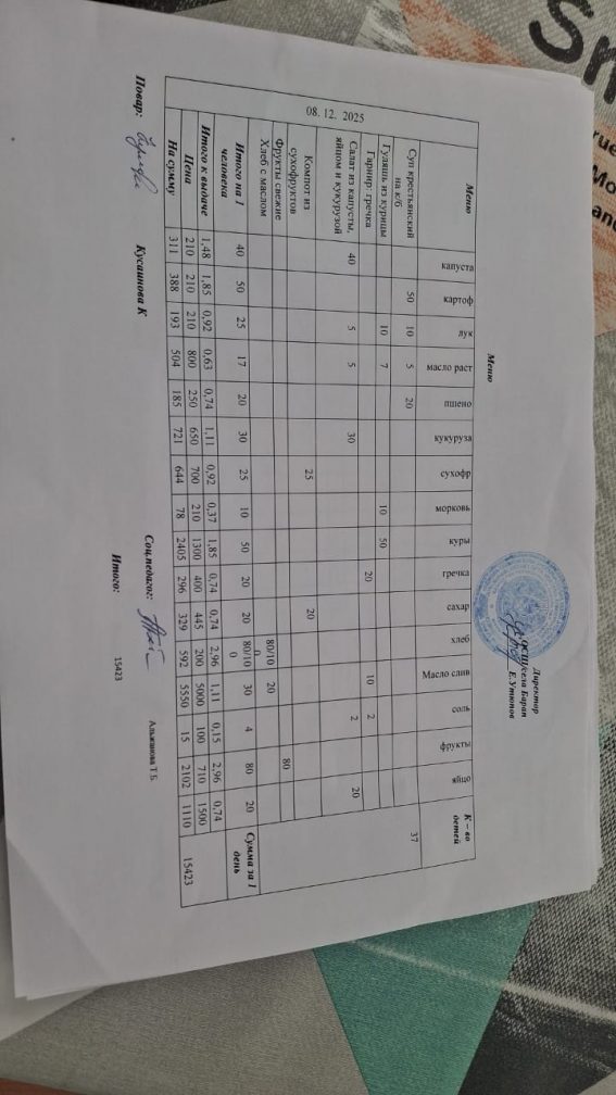 Бір күндік ас мәзірі 08.12.2025 ж