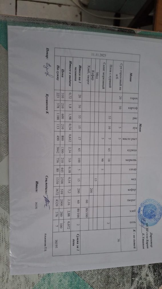 Бір күндік ас мәзірі 11.11.2025 ж