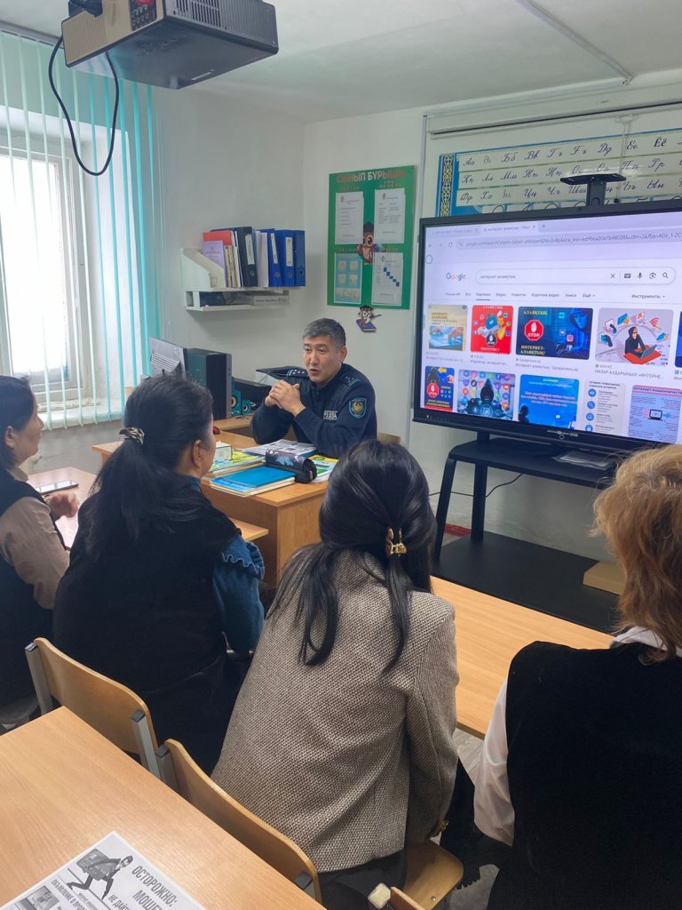 Учaскелік полиция қызметкері мектебімізге ұжыммен келіп, интернет алаяқтықтың түрлері мен алдын алу жолдары туралы түсіндірме-анықтама жұмысын жүргізді.